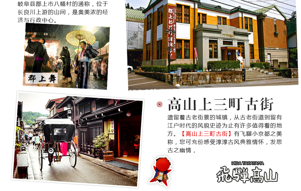 【郡上舞】通过歌词“出郡上八幡町时,不下雨也湿衣袖”为日本民众所熟悉,它与山形县的“花笠舞”和德岛县的“阿波舞”并称全国三大民谣舞蹈。“郡上舞”有400多年的历史,现在已被指定为国家的重要非物质民俗文化遗产(来源于人们的日常生活并得到继承的、与衣食住行、职业、信仰、每年固定的节庆活动等相关的风俗习惯、民俗艺术当中,国家认为特别重要并予以指定的民俗文化遗产”)。