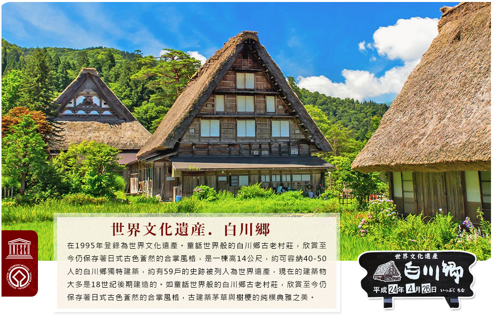 【白川乡合掌村】,为世界文化遗产,遗留在白川村和富山县五个山村的合掌式构造房屋的村落。其地处豪雪地带、再加上阻绝、形成地域独特的风俗文化,至今仍完整保留为日常生活之用,其中以合掌型的茅草家屋最为著名。屋旁田地园圃交错衔接,构成一幅浓厚怀古幽情、山间农村的田园景观,您亦可前往位于北方萩町部落禁头的小丘上,有一座于战国时代建立的城堡,后因地震而只剩城迹,这里是鸟瞰萩町的最佳观景处,前后左右尽是合掌式建筑喔。
