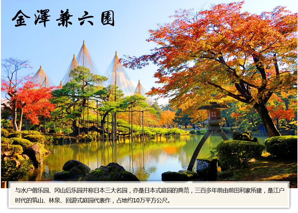 【金泽兼六园】与水户偕乐园、冈山后乐园并称日本三大名园,亦是日本式庭园的典范,三百多年前由前田利家所建,是江户时代的筑山、林泉、回游式庭园代表作,占地约10万平方公尺。其名引自宋代诗人李格非《洛阳名园记》所述,名园需兼具符合宏大、幽邃、人力、苍古、水泉、眺望等六胜,因而被取名为《兼六园》。