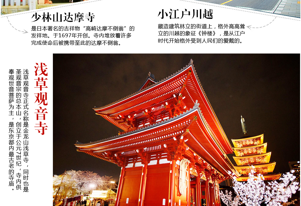 【浅草观音寺】浅草观音寺正式名称是金龙山浅草寺,同时也是圣观音宗的总本山,创立于公元7世纪,寺内供奉观世音菩萨为主,是东京都内最古老的寺庙。在公元1945年曾经被烧毁,重建于公元1958年。大门上悬挂100公斤,书写「雷门」二字的巨型灯笼,寺前是宝藏门,据说其中一道门的顶端藏有寺庙宝藏,旁边五重塔高达64公尺左右,建于天庆5年(公元942年),原是木造,后被大火烧毁。庆安元德家光重建,但在二次大战时再度烧毁,昭和48年11月重建。