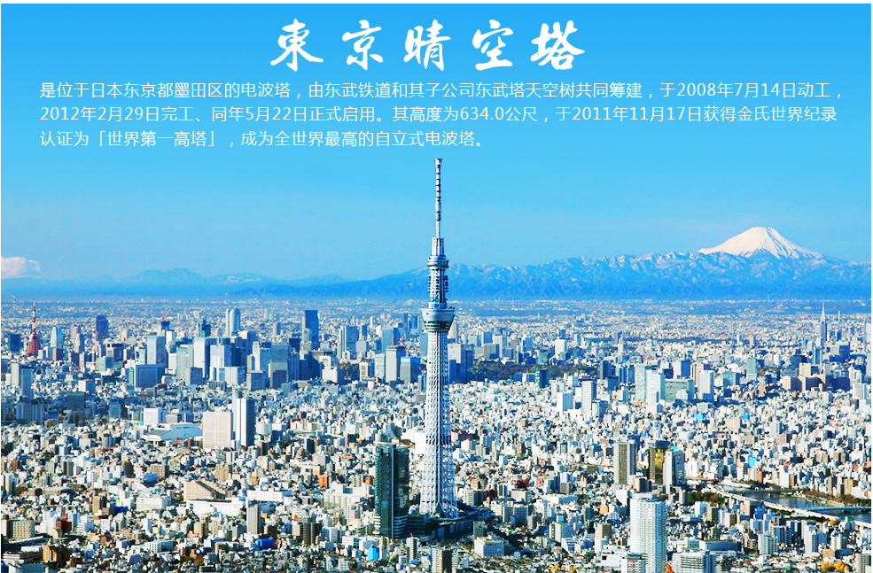 【东京天空树】(远眺)又称东京晴空塔、新东京铁塔,是位于日本东京都墨田区的电波塔,由东武铁道和其子公司东武塔天空树共同筹建,于2008年7月14日动工,2012年2月29日完工、同年5月22日正式启用。其高度为634.0公尺,于2011年11月17日获得金氏世界纪录认证为「世界第一高塔」,成为全世界最高的自立式电波塔。其亦为目前世界第二高的人工构造物,仅次于哈里发塔。之后前往东京成田国际空港,由专人协助办理搭机手续后,若时间许可,可于机场内的精品商店街选购各式精美纪念品以馈赠亲友;搭乘豪华客机飞返浦东机场,在互道珍重再见声中结束此次旅程,在亲朋好友的欢迎下,结束此趟愉快的日本之旅。
