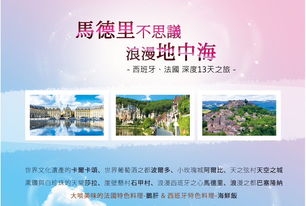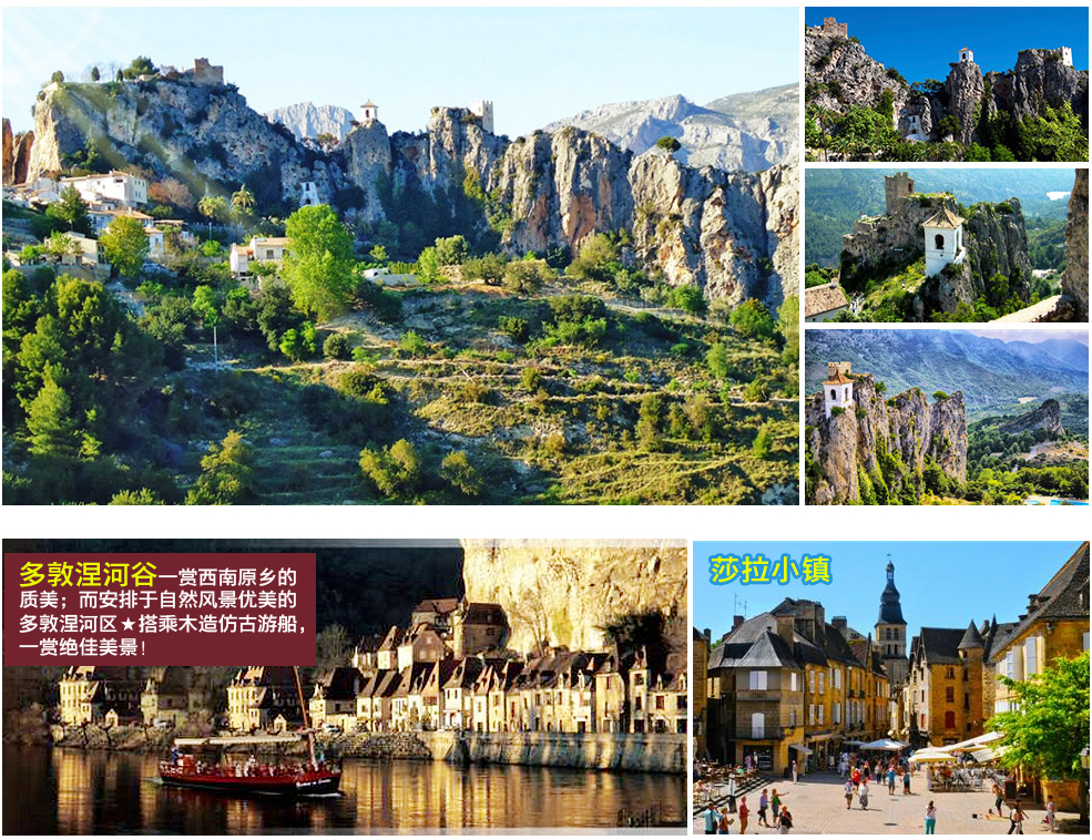 多敦涅河谷的神秘、文艺复兴古都-莎拉小镇、此时正想象着,走进旅游书中画面的那一刻,会是什么样的感觉,以最佳的状态来迎接令人期待的小镇之旅。◎石甲村:法国多敦涅河谷旁最美的乡村小镇。石甲村就是一个建筑在石壁中,是一个美丽的崖壁悬村...走一趟这个崖壁悬村,发现它的美丽....。多敦涅河谷一赏西南原乡的质美;而安排于自然风景优美的多敦涅河区★搭乘木造仿古游船,一赏绝佳美景!随后专车前往举世知名的波尔多葡萄酒首府,波尔多市区18世纪的古典建筑群呈现最和谐的布局。建筑群中不乏保持完善的壮丽建筑,大部分都已列入联合国的世界遗产名录。节庆的气氛、高质量的生活环境、顶级葡萄酒、美食、文化与精品购物等等,所有观光的元素,都可以在这里找到。波尔多是古罗马商港,位于法国西南部之吉伦特区,著名的梅花广场号称是欧洲最大的广场,此地可以说是世界最大以及高级的葡萄酒产地,共有一百七十五个优等的葡萄酒庄,座落在加隆河的两岸。随即展开市区观光。