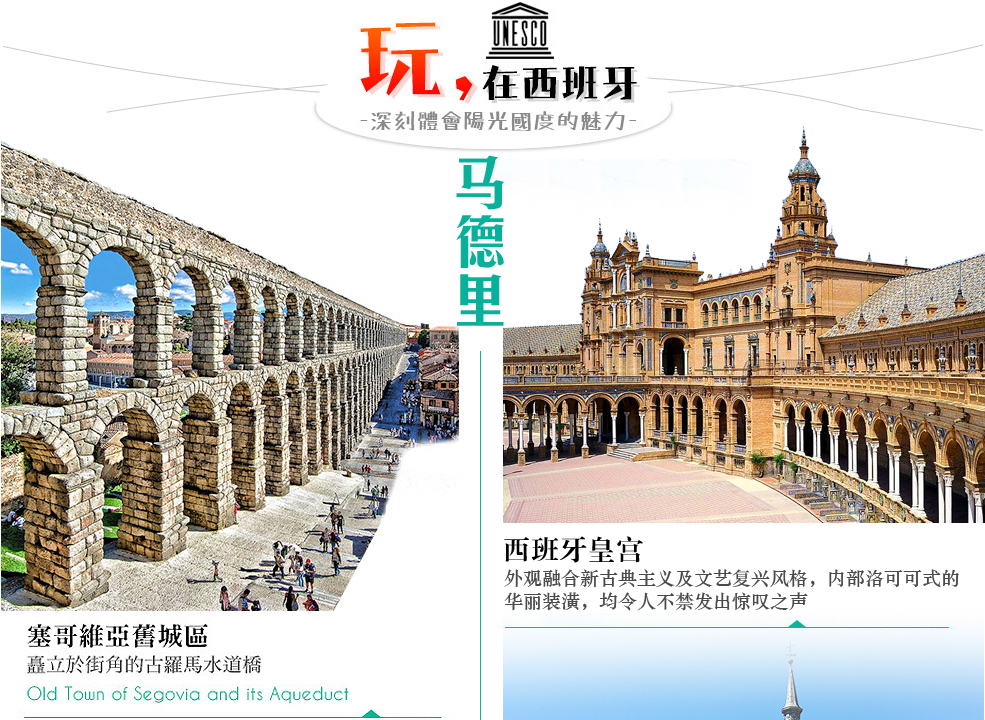 斗牛士、佛朗明哥舞、海鲜饭、Tapas、橄榄树、迷人的地中海…是每个人对西班牙的第一印象。抵达阳光浪漫国度-西班牙后,专车跨过美丽的瓜达拉马雪山,在沉浸于沿途优美的景致中,来到古城-塞哥维亚,矗立于街角的古罗马水道桥,长长的水道宛如将过去与现在连结一起阿卡萨城堡里尽管卡斯提尔已不再、白雪公主从此与白马王子过着幸福、快乐的日子,古堡、山城、教堂..,面对此佳景,当自觉何谓『美丽人生』!今晚我们特别安排于当地知名的火腿博物馆里享用西班牙小馆文化餐食Tapas。