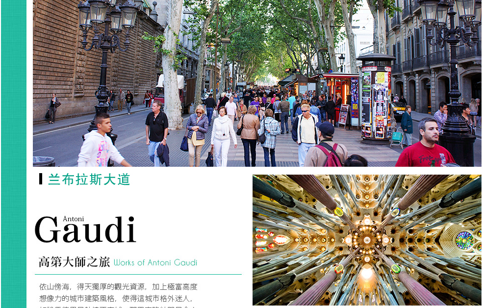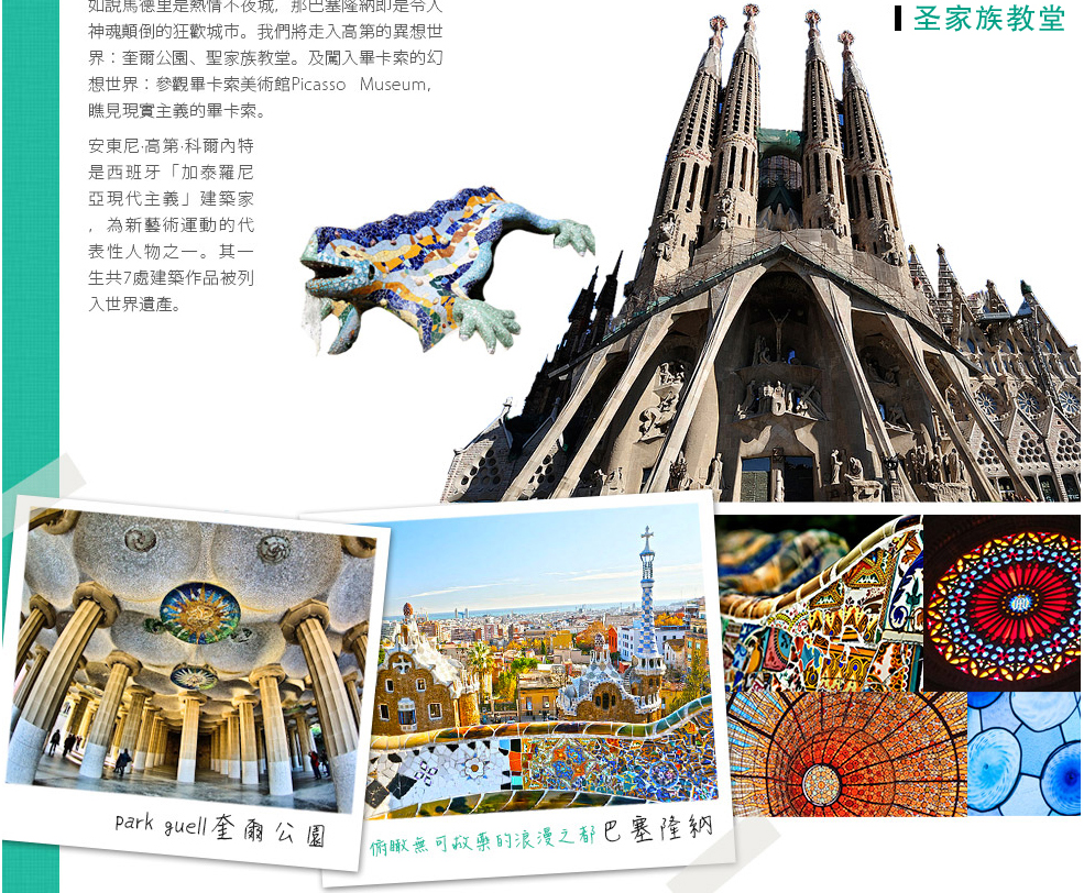 Buenos días!Barcelona!今早来趟艺术之旅,接着朝圣高第的著名作品圣家堂,巴塞罗那因高第而与众不同,圣家堂以完美而协调的手法呈现,线条简洁而利落,令人激赏。午后来到有着波浪形设计的外观米拉之家,充分表现自然主义且创意无限的,接续漫步在奎尔公园中有如蛋糕一般的梦幻小屋、希腊式的百柱,教人不由自主的再一次为建筑鬼才-高第的才能所慑服。