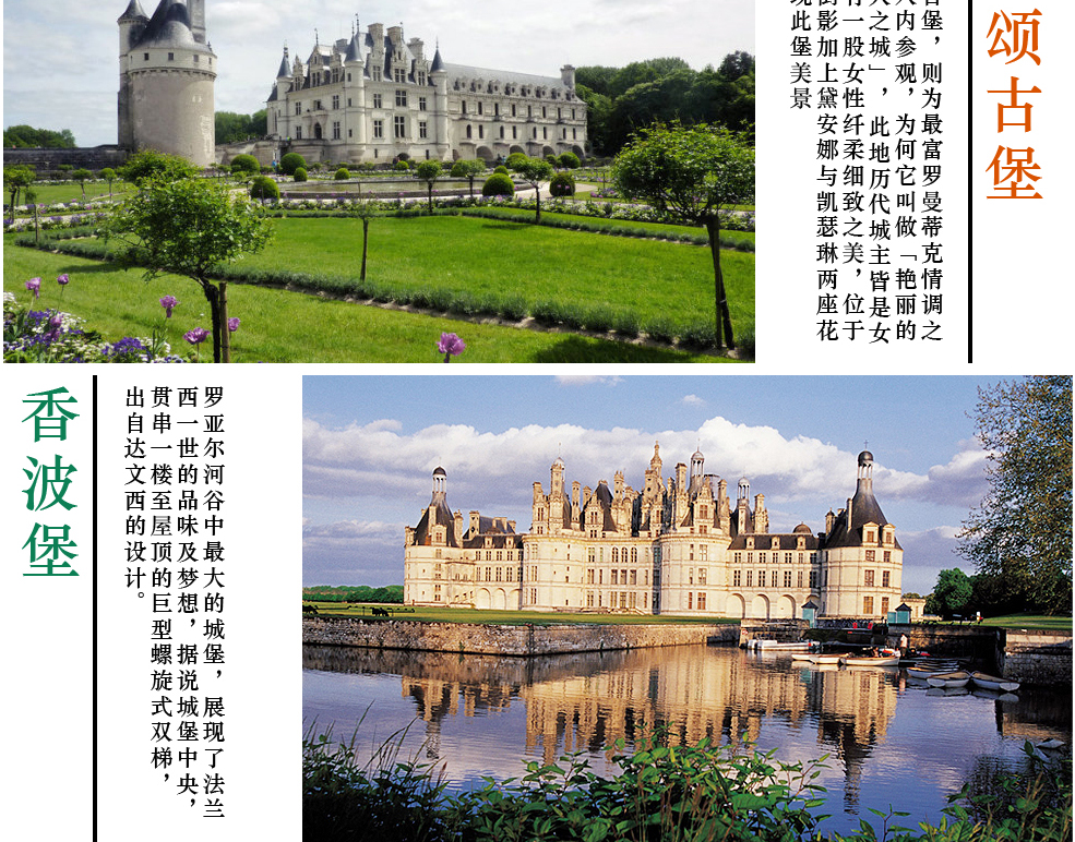 今日专车前往法国中部-杜尔。抵达后专车前往伫立于雪河上-★香浓颂古堡,则为最富罗曼蒂克情调之古堡,请入内参观,为何它叫做「艳丽的六位贵富人之城」, 此地历代城主皆是女性,因此有一股女性纤柔细致之美,位于雪河中的倒影加上黛安娜与凯瑟琳两座花园,更显现此堡美景,而后专车返回饭店休息。