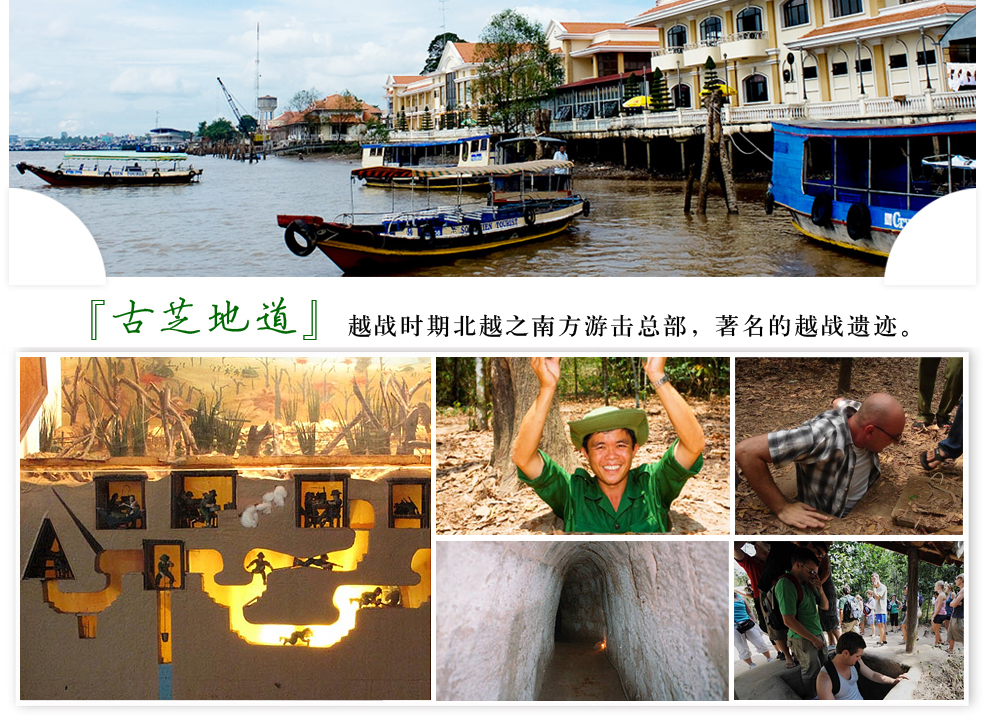 今日前往著名的越战遗迹-『古芝地道Cu Chi Tunnels』,位于胡志明市西北郊75公里处,是越战时期北越之南方游击总部。在方圆420公里的丛林里,地道共分三层,深达地下9米,地道长250公里,地道是由数十条宽不及80公分、高度从70~150公分交错组成的连结在一起,内有简陋的医疗室、会议室、总司令室、厨房、餐厅等。地道入口处以树枝、树叶遮盖,很难找到。战时人称〝越共总部〞或〝红色首府〞。游客在此可见到直升机、战车、碉堡…等之残骸,体验到近代战争的残酷与可怕,旅客至此可亲自体会越战恐怖气氛。返回胡志明市参观【统一府】前越南时期之总统府,其前身为1868年奠基的诺罗敦宫(Norodom Palace),1954年法军于奠边府战役失利后,诺罗敦宫移交给南越首相吴庭艳,而改名为「独立宫」。【战争博物馆】馆内主要介绍及展出美军在越战时期的展品,并且是外国游客常到的景点之一。接着参观已有百年历史的【天后宫】,随后外观游览【百年歌剧院】和法式【红教堂 邮政大楼】。