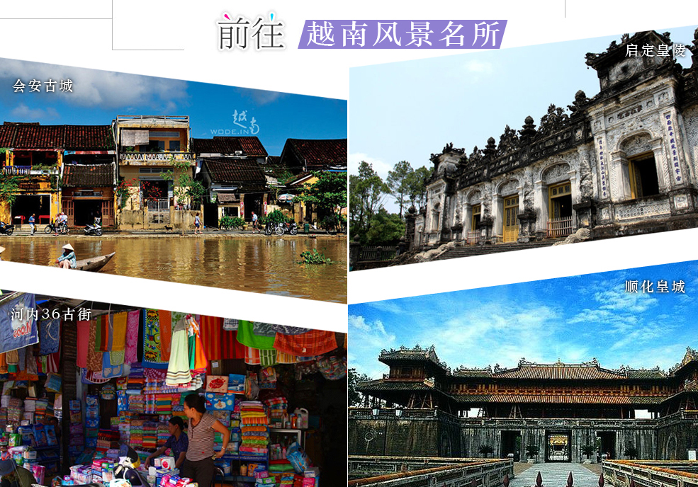 早餐后乘车前往越南中部【顺化古都】从19世纪开始就是越南阮王朝的首都,因此今天的顺化到处可见王宫、王陵等历史遗迹。途经景色绚丽如画的【海云岭】,此为越南最神秘之海岸线—您可于海云岭上欣赏景色秀丽宜人之海岸线风光及感受到60年代越战时期两军隔山对峙的紧张气氛。「海云岭」是由芒高、白马、巴那、海云等四座山所组成的峰群。由于山岭上终年白云缭绕,白云、蓝天、苍海浑如一体,如海似云「海云岭」因而得名。越南中部的长山山脉,由寮国边境穿越越南迤逦向东,一直伸入南中国海。主峰海云山的海云岭,被称为「越南的脊梁」,接近越南神秘的十七度纬线,是南北越的中间点,南北交通要冲。由于越南地势狭长,这里也是天气的分割线,同时也是广南岘港省和承天顺化省的天然分界。于二零零九年被列为世界遗产。今日展开精采的古都巡礼,首先前往皇陵建筑参观『启定皇陵Khaidinh’sMausoleum』,此皇陵又称为「应陵」,隐于周珠山(chau chu)的山丘上,1920年开始建造,直到启定帝驾崩六年之后(1931年)才完工。建筑风格采用东西合璧,远看整座皇陵很像一座气份神秘的欧式城堡,与其它皇陵大不相同。皇陵呈日字形,分为三阶段的楼梯供有127阶,每阶段的栏杆上各有四条龙;上了阶梯可以看到马、象、仆人等守护陵墓的石像。后面是二层楼、八角形建筑,其两侧各有一座欧式高塔。内部地板铺着彩色的琉璃瓦,墙上有巨幅祥龙壁画,内厅的左右两侧有花磁砖与碎玻璃拼成的彩色壁画,天花板则以黑白色调的云龙装饰而成,叙述着各种不同的故事主题。【大内皇城】越南阮朝十三代皇宫(紫禁城),约600公尺四方的皇宫王城,(The Citadel andImperial City),内外共分三层,最外层因为护城,宽21公尺高7公尺,周长共有10公里,开有十道门,并有护城河围绕,城内有庞大的宫殿、内有午门、太和殿、寺庙及花园、桥梁等古建筑群体。阮朝开国君王于1804年始建,费时30年完工,为1802年至1945年阮朝之皇都,此地就像中国的北京紫禁城有异曲同工之妙。联合国科教文组织于1994年认定紫禁城为「世界文化遗产」肯定其观光价值,您会发觉古迹上所有古迹上题字都是我们所熟悉的中国文字,这是因为中国与越南的历史渊源深厚。今晚上专为各位贵宾安排地道的顺化皇帝宴。