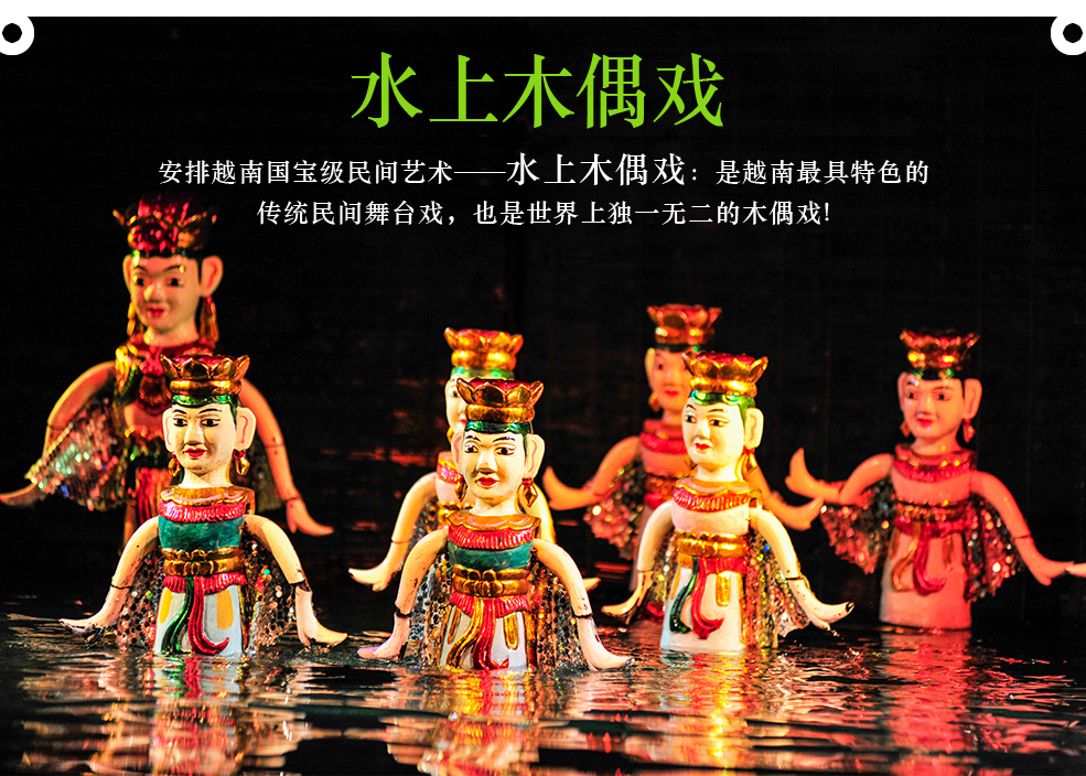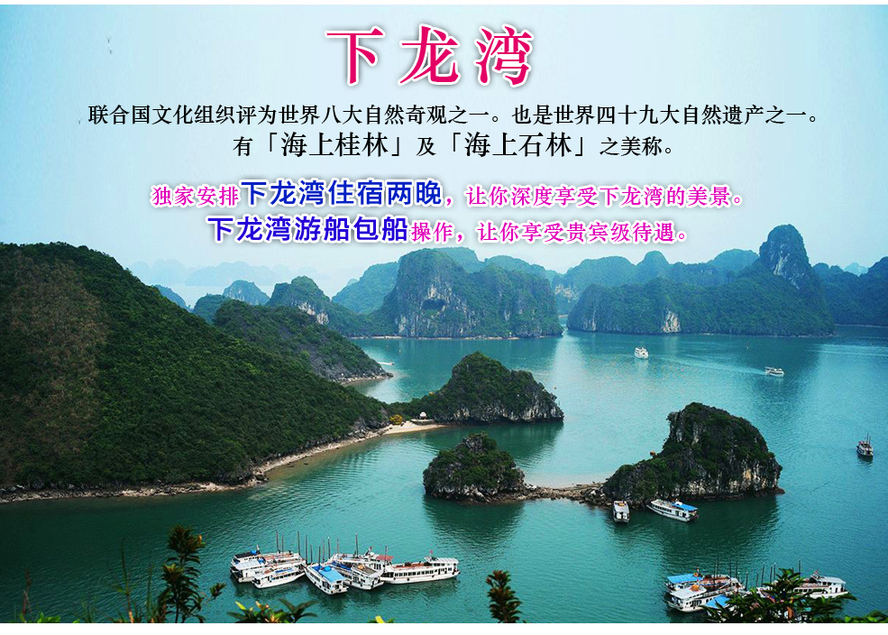 早餐后前往码头搭船游览世界八大奇景之一【下龙湾】-------可以说是越南行程中最绝妙的景致。下龙意即「降下神龙」的意思,源自于地方的神话故事,传说中玉皇大帝命令天上的神龙与其后代阻止海上的外来侵略,因此神龙变从嘴里吐出翡翠,落至凡间变成变成令人惊奇的岛屿及喀斯特地形,其范围非常广泛,面积约有4000平方公里,其中散布超过一千六百座石林及石笋状的小岛,这些小岛亦有「龙岛」、「猴岛」、「龟岛」、「蟾蜍岛」、「斗鸡岛」......等别名;海面上突起的奇形怪状天然岩石雕刻,相当生动,而无数个岩洞更创造出一处令人陶醉不已的永恒世界,乘船绕行其中,体验大自然的鬼斧神工之妙,中午在本团专属的游船上享用船家为您精心准备的海鲜餐(因为北越还是属于观光刚起步的落后国家,船上餐食可能无法跟其它东南亚国家相提并论,敬请各位贵宾见谅!),您也可另向此地特有的水上养殖市场选购您喜爱的海产,生鲜超值!接着带您登陆岛上一窥究竟,您会发现许多天然钟乳石洞穴,…等,最大者可容纳三千余人,洞内充满钟乳石奇景,令人叹为观止。于傍晚返回码头,晚餐后欣赏水上木偶戏:是越南最具特色的传统民间舞台戏,也是世界上独一无二的木偶戏,它稀奇的地方,就在于木戏于水池面上演出,表演者必需长时间浸泡于水中,利用用强劲的臂力及纯熟的控绳技巧,让玩偶生灵活现的演出各项传说故事,其动静合宜的神态令人拍案叫绝!!