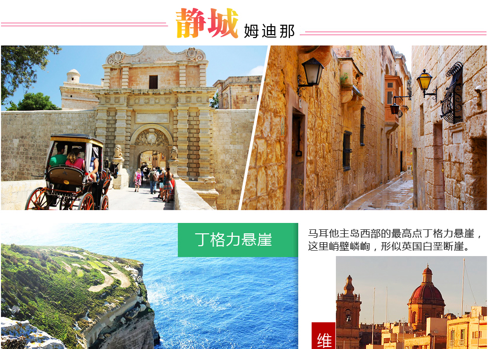 早餐后,前往机场乘机前往马耳他的瓦莱塔,抵达后,乘车前往“静城”姆迪那:MDINA 在阿拉伯语中意为“城堡”、“教堂之城”同时又因只有千余居民住于城中,加之禁止汽车通行,终日安静祥和被当地人冠以“静寂之城”的美誉,城中大教堂自诺曼时期以来一直为马耳他主教堂,巴洛克式的建筑风格,早先由来自西西里的石匠于1100年开工建造,1693年毁于地震,1697年重新设计建造,并保留至今。穆迪娜城外的村庄拉巴特,曾作为外景地出现在电影《慕尼黑》中。之后前往马耳他主岛西部的最高点丁格力悬崖,这里峭壁嶙峋,形似英国白垩断崖。之后前往三城之一的维托里奥萨参观充满地中海特色的马耳他城市景观,三城原是骑士团来到马耳他最初的驻地,拥有众多军事建筑,和比一港之隔的瓦莱塔更久远的历史。
