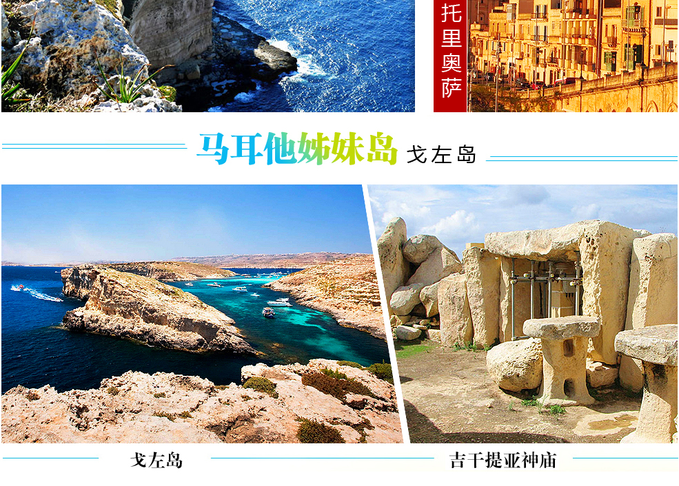 早餐后,前往渡轮港口,乘渡轮前往马耳他姊妹岛---戈左岛。罗马时期修建的要塞堡垒位于戈佐岛中央, 历史中海盗横行,要塞遂成为海盗来犯时,居民的避难所。为了纪念英国女王,将此城堡命名为维多利亚即“胜利”之意。渡轮抵达后前往,吉干提亚神庙★,这座公元前6~2世纪发展的巨石文化群,比埃及金字塔还早诞生500-1000年。圆形的庙宇设有无数的祭坛,据推测古时人们用此地来举行丰收仪式。之后路过前往卡利普索的洞穴,相传‘荷马史诗’中的大神之女‘卡利普索’藏身的洞穴。据史诗《奥德赛》所属,卡利普索爱上迷途的奥德赛,将他囚禁于此地的洞穴中。然后抵达,戈佐岛西南边的德维拉湾,呼啸千年的海涛击穿了高耸的巨石,形成了壮观的自然景象,被当地人称之为蓝窗闻名于世同时也是世界自然文化遗产之一。穿过窗子可以一睹蓝色波涛,每年的特定时间,可以看到‘窗中日落’的奇景。但是随着风化日趋严重,如此壮观的石拱,可能将于数年后坍塌。返回戈左首府维多利亚,尽兴游览之后乘船返回马耳他岛。