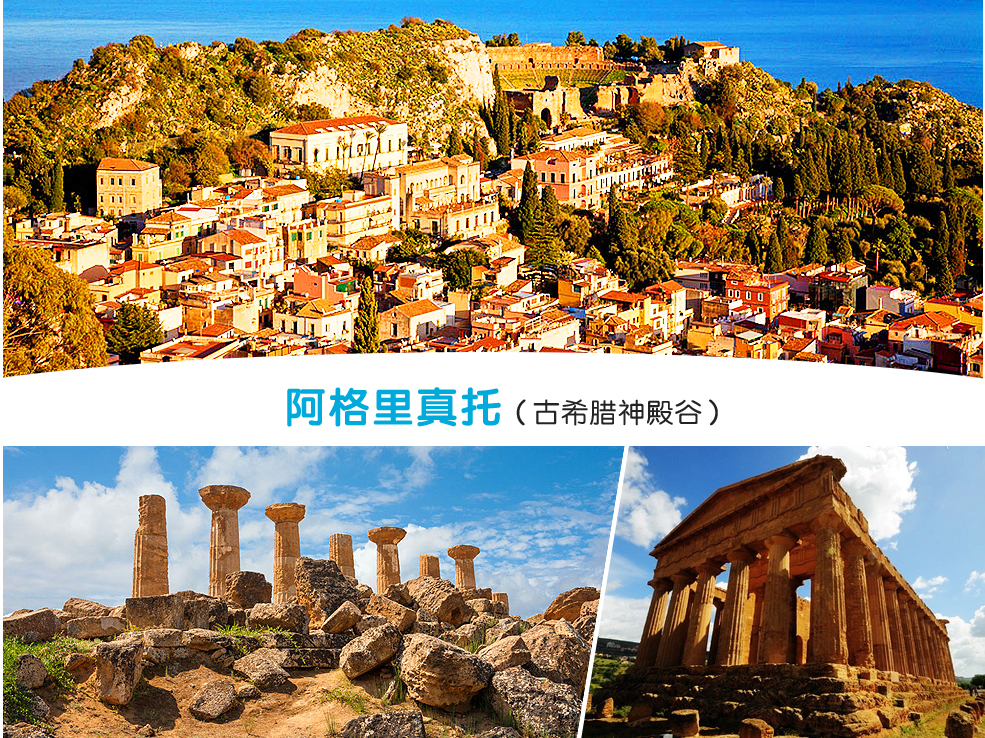 早餐后,乘车前往阿格里真托,抵达后参观:世界著名文化遗产--古希腊神殿谷★该公园是拥有六座神庙的大公园,由高向低分别为:赫拉神庙、协和神庙、战神神庙、宙斯神庙、孪子神庙(卡斯托和波拉克斯神庙)、火神(伏尔甘)神庙。远看还有医神庙、得墨忒爾岩石神庙。后入住酒店休息。