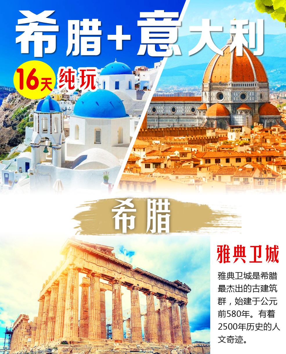 希腊双岛(米岛+圣岛)/天空之城+意大利16天纯玩游