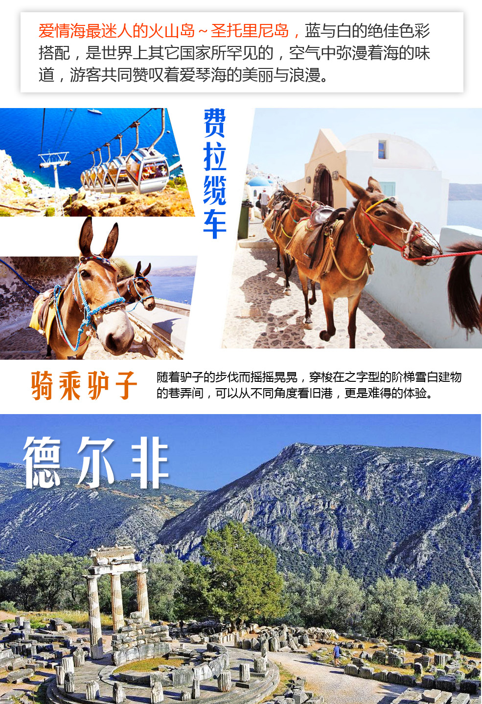 早餐后安排在圣托里尼之首邑-费拉Fira:整个白色城市位于海岸悬崖顶端,从海上看好像是山头的残雪!费拉小城的白色屋宇,狭窄的巷道,露天咖啡座及点缀于陡峭山坡上的小商店组成了圣托里尼的印象。特别安排搭乘★缆车至旧港,缆车依着陡峭的崖壁而建,300公尺的海拔落差,透过缆车的窗子由高空眺望美丽旧港码头与之字型阶梯,山璧景观的变化。再由旧港码头★骑乘驴子,随着驴子的步伐而摇摇晃晃,穿梭在之字型的阶梯雪白建物的巷弄间,可以从不同角度看旧港,更是难得的体验。带着对圣托里尼岛的爱,安排搭乘渡轮返回雅典。