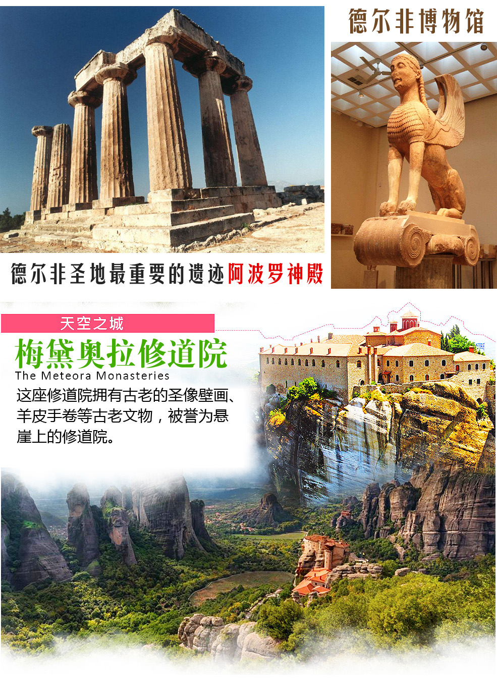 早餐后专车前往希腊文化中心德尔非。传说中宙斯指派两只鹰去寻觅世界的中心,希腊神话中,宙斯从世界的两端各派出一只老鹰,向世界的中心飞去,他们就在德尔非相遇,因而这里成为世界的中心。这里也是古代最驰名也最受尊崇的神谕遗址。德尔非阿波罗神,祂的神谕对于希腊人有极大的影响。据说人们若能听从祂的神谕,体会其中的忠告,都可平息很多纷争。神谕也指引希腊人建立了许多殖民地,因此后来德尔非出现了著名的阿波罗神庙组群。太阳神阿波罗(Apollo),守护着德尔非城。这里的风光相当明媚,是希腊有名的圣山,宇宙中心点的石碑就立于此,而有名的神谕也是从这里的神庙流传,德尔非神庙的神谕通常都相当暧昧模糊,难以辨认,但是却相当准确。参观德尔非圣地最重要的遗迹-★阿波罗神殿,为当时请示神喻之地。之后参观★德尔非博物馆,馆内珍藏阿波罗神殿重要真品,如代表世界中心的肚脐之眼。随后驱车北上晚间夜宿于山下的小镇卡兰巴卡。