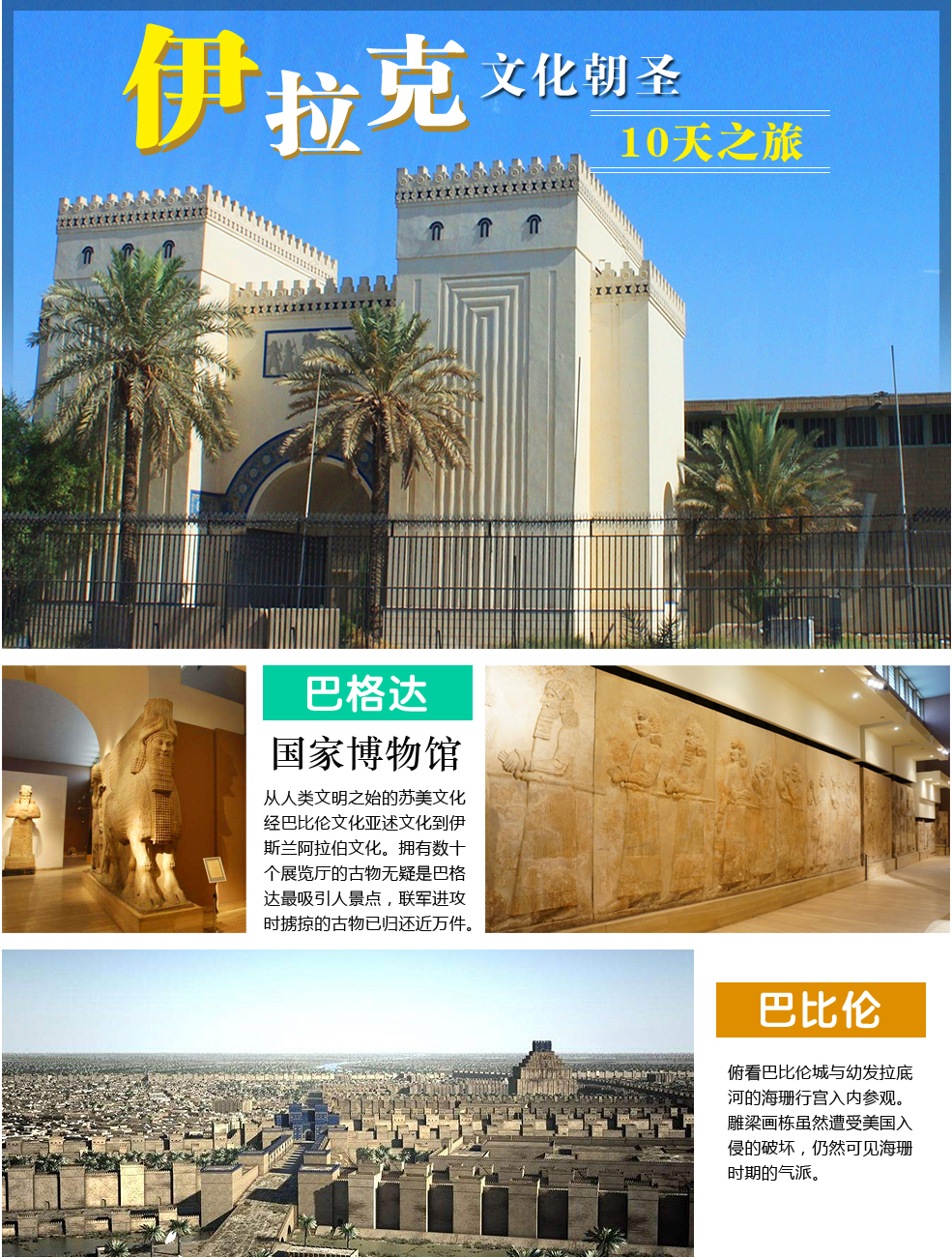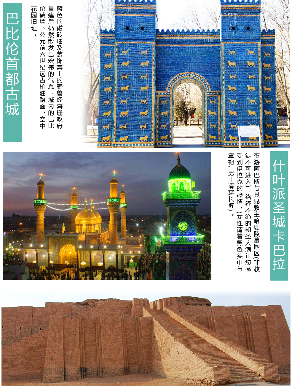 搭车往南前往古巴比伦首都古城,蓝色的磁砖墙及装饰其上的野兽经海珊政府重建后仍然散发出宏伟的气息,城内的巴比伦砖墙、公元前六世纪远古柏油路面,空中花园旧址。有名的巴比伦之狮仍然让人缅怀过往的光辉,希腊亚历山大大帝远征到印度班师回朝命丧皇宫处。出城的路上检查安全岗哨耗时,请耐心配合安检。俯看巴比伦城与幼发拉底河的海珊行宫入内参观。雕梁画栋虽然遭受美国入侵的破坏,仍然可见海珊时期的气派。下午转往先知亚伯拉罕的出生地BIR Nimrud及其附近可能的八别通天塔遗址。晚间前往什叶派圣城卡巴拉,夜游阿巴斯与其兄教主哈珊陵墓园区(非教徒不可进入),络绎不绝的朝圣人潮让您感受到伊拉克的热情,(女性请着黑色头巾与罩袍, 男士请穿长裤)。