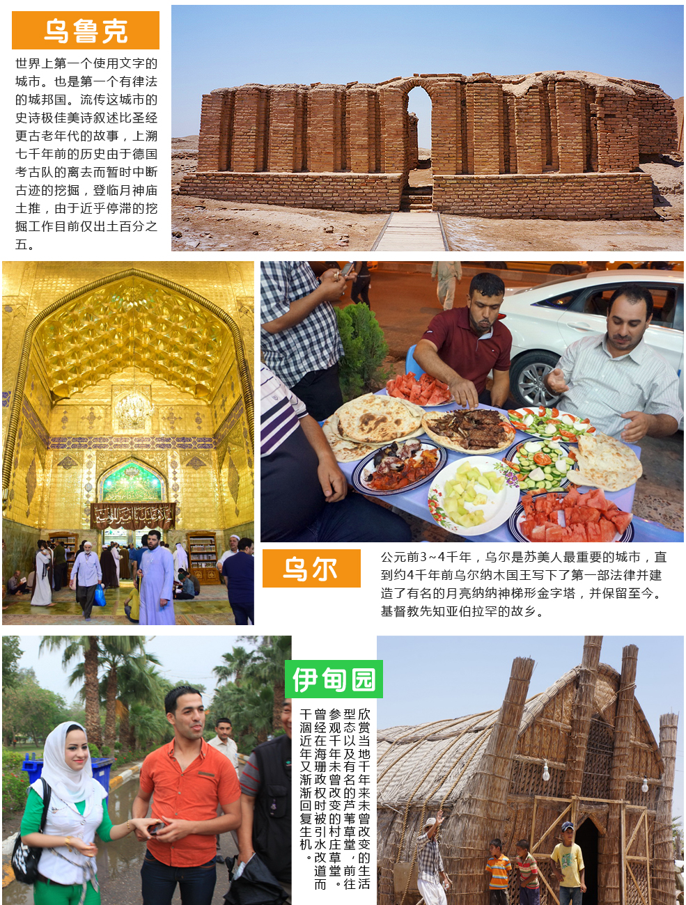 搭车前往幼发拉底河边的乌尔,公元前3~4千年,乌尔是苏美人最重要的城市,直到约4千年前乌尔纳木国王写下了第一部法律并建造了有名的月亮纳纳神梯形金字塔,并保留至今。基督教先知亚伯拉罕的故乡。亚伯拉罕虔诚服侍上主,不惜以自己的儿子为牺牲献祭,此段坚贞的奉献,成为基督教、犹太教和伊斯兰教共尊的先知。也影响到伊斯兰教每年3百万人麦加朝圣的壮举。未能前往乌尔是前任教宗最大的憾事之一。他曾经说道:若未去一切事情的起点乌尔,那么就无法到达圣经的任何一地。参观乌尔梯形金字塔与亚伯拉罕的家后沿着公路前往千年生活方式未曾改变的沼泽生活区。