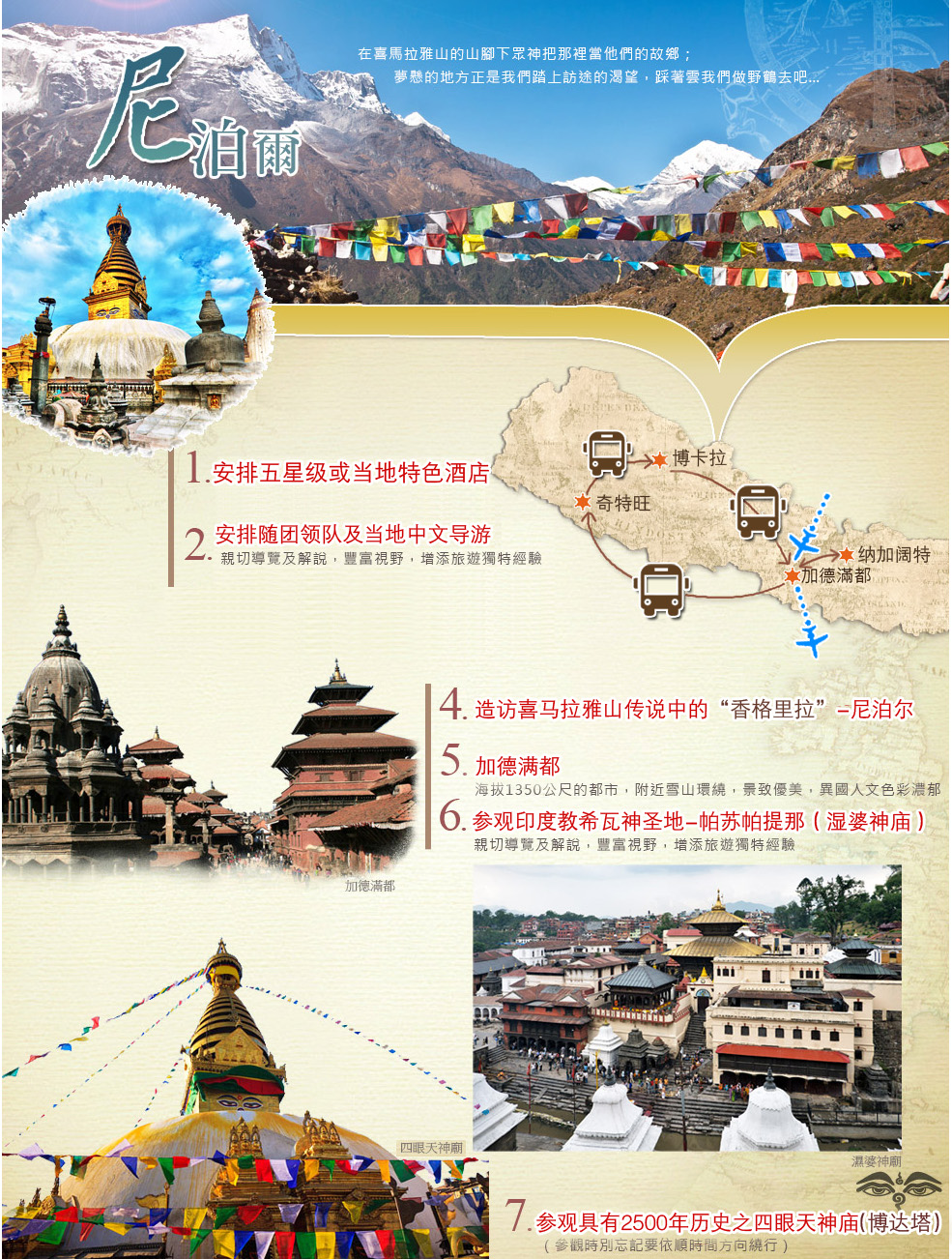 早餐后专车返回加德满都(约5小时)。游览斯瓦扬布拉特寺和博达哈大佛塔—均为世界文化遗产。斯瓦扬布拉特寺位于可以俯瞰加德满都的山顶,目前己被猴子们占据,是一个让人着迷并略显混乱的佛教和印度教并存的寺庙。整个寺院都围绕一个闪闪发光的白色佛塔而建,是加都山谷最瑰丽的珍宝之一。镀金的塔顶绘有佛眼,这些眼睛在加都山谷似乎无处不在,是尼泊尔宗教建筑的象征。此处可俯瞰加都的全景,是拍摄加德满都风景的绝佳之处。博达哈大佛塔(Bodhnath被列入联合国教科文组织世界文化遗产名录),是尼泊尔的标志性建筑。恐怕再也找不到像博德纳这样的地方。这里有全亚洲也是世界上最大的佛塔,每天有成千上万的信众聚到这里。身着栗色长袍的光头喇嘛在满是经幡的街道上游走,朝圣者一边转动手中的经筒——一边购买酥油和糌粑。这是世界上为数不多的能够近距离接触藏传佛教文化的地方。在历史的长河中,这座佛塔是拉萨和加德满都之间商道的重要补给站,以骑着牦牛进入喜马拉雅山之前,西藏商人会在此祈求神灵保佑他们一路平安。