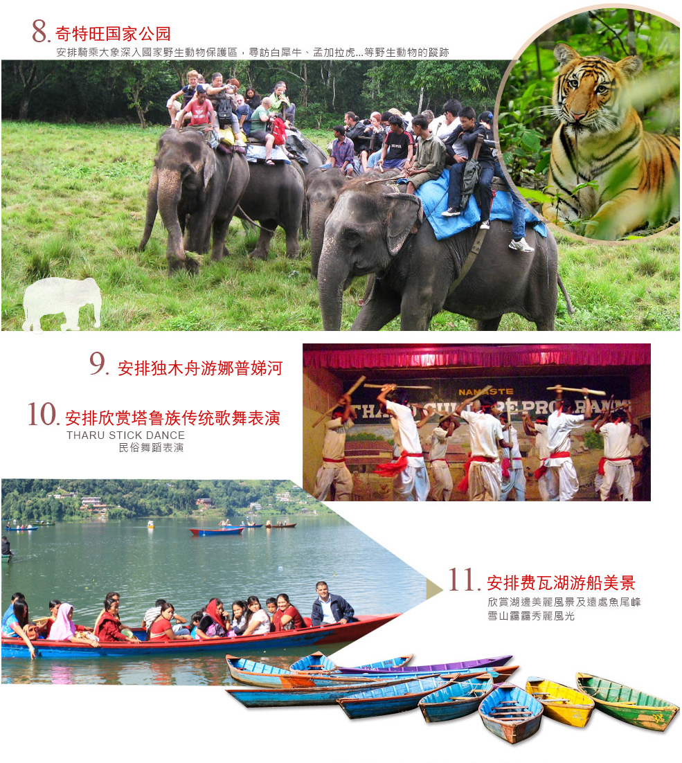 早餐后专车前往世界自然遗产奇特旺森林公园(约5小时)。奇特旺国家公园是尼泊尔人气最旺的旅游目的地之一。这里是世界上为数不多的可以在向导陪同下进行徒步探险的野生动物公园。回到原始环境中与动物共处是一段让人愉悦而难忘的经历。这里海拔仅有150米,面积980平方公里,是南亚最大、也是尼泊尔第一个国家森林公园。这里是亚洲独角犀牛的最后家园、孟加拉国国虎分布最为集中的地区。除了犀牛和老虎,奇旺还有各种花草及动物,这里有四种鹿群,还有包括斑马、豹、长毛熊、野猪、猕猴、灰叶猴、印度野牛(世界上最大的野牛)和其它许多小动物,以及沼泽鳄鱼。抵达后安排乘坐独木舟(时间45分钟),在娜普娣河(Rapti)河上漂流,如果运气好的话还可以看到野生的鳄鱼和漂亮的水鸟。之后离开独木舟进入丛林,徒步在原始丛林中,追寻动物的身影。之后前往大象养殖基地,听大象训导师及导游介绍大象生活习性等。晚餐后特别安排贵宾欣赏塔鲁族传统歌舞表演。