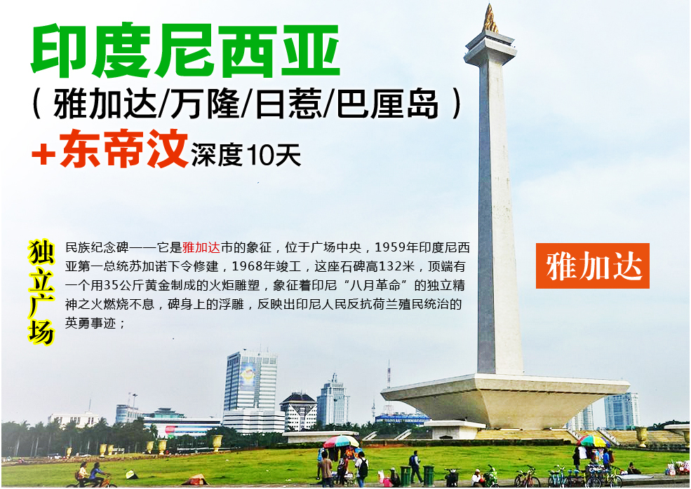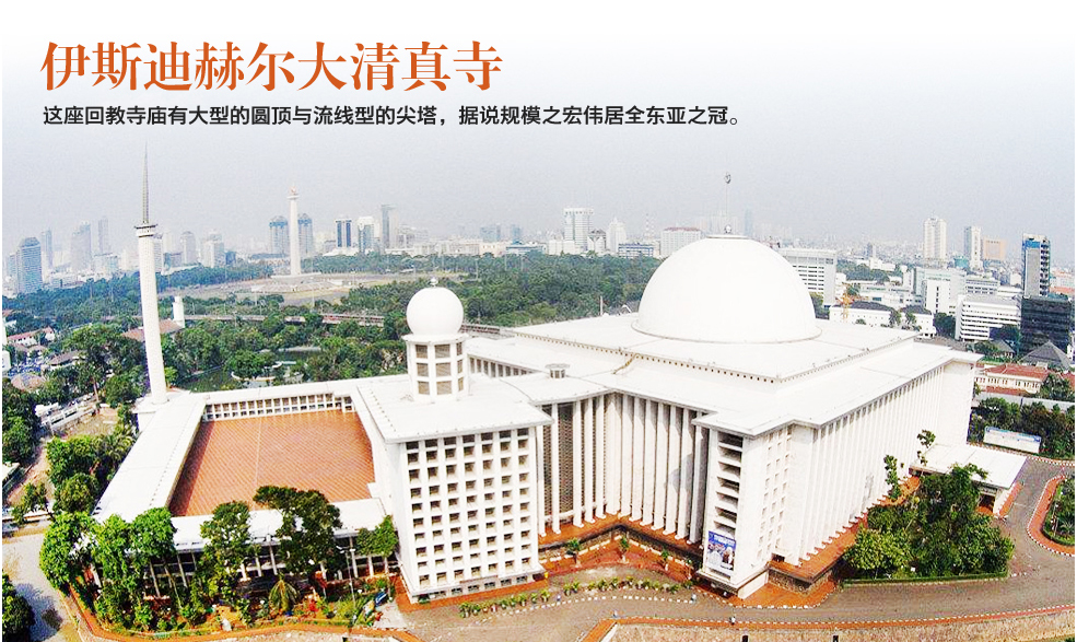 今日准备好行李及装满希望的行囊,集合于上海浦东机场,搭乘豪华客机飞往雅加达,抵达后参观:独立广场:民族纪念碑——它是雅加达市的象征,位于广场中央,1959年印度尼西亚第一总统苏加诺下令修建,1968年竣工,这座石碑高132米,顶端有一个用35公斤黄金制成的火炬雕塑,象征着印尼“八月革命”的独立精神之火燃烧不息,碑身上的浮雕,反映出印尼人民反抗荷兰殖民统治的英勇事迹;前往对面的总统府(外观)并拍照留念;游览伊斯迪赫尔大清真寺——这座回教寺庙有大型的圆顶与流线型的尖塔,据说规模之宏伟居全东亚之冠。享用晚餐后前往酒店休息。