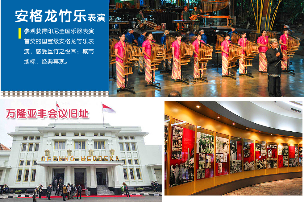 早餐后前往游览印度尼西亚缩影公园,参观游览世界上第一个介绍国土知识的缩影公园,是印尼著名旅游景点之一。公园中央设有巨型印尼群岛模型图,四周园地划分为巴利区、雅加达区等33个区,每个区内有当地传统特色的建筑和植物。参观主要景点苏门答腊馆、苏拉威西馆及伊利安馆、印尼群岛模型图,四周园地划分为巴利区、雅加达区等33个区,每个区内有当地传统特色的建筑和植物。领略印尼各地的风光特色,了解印度尼西亚的文化和建筑。参观老城区包括中央区 (Jakarta Pusat)、西区 (Jakarta Barat) 。谈到老城区,不能不提到知名的是草埔(Glodok)、班芝兰兰(Pancoran)、卡渣玛达 (Gajah Mada)、哈炎乌禄 (Hayam Wuruk)等这些传统的唐人街。应该说,老城区唐人街的繁衍发展,带动雅加达成为市井之都,再跃为全国商业中心。之后前往万隆,参观万隆亚非会议馆旧址(停留约1小时)。这里始建于1895年,曾在1955年举行的亚非会议取得了巨大的成功,万隆会议的成功召开形成了以“团结、友谊、合作、和平共处、求同存异”等为核心的万隆精神。晚餐后入住酒店休息。