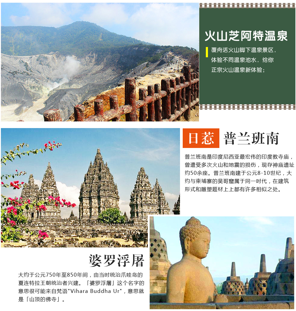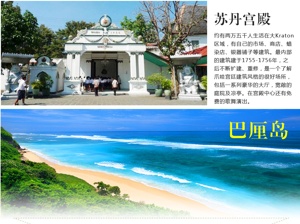 早餐后前往参观普兰班南是印度尼西亚最宏伟的印度教寺庙,曾遭受多次火山和地震的损伤,现存神庙遗址约50余座。普兰班南建于公元8-10世纪,大约与柬埔寨的吴哥窟属于同一时代,在建筑形式和雕塑题材上上都有许多相似之处。神庙有三层院落,外面两层的建筑多已是一片废墟,只有最内层保存着几座神庙,3座宏伟的主庙分别供奉湿婆、梵天和毗湿奴,另外3座小庙分别供奉他们的坐骑神牛、神鹅和神鹰。前往婆罗浮屠大约于公元750年至850年间,由当时统治爪哇岛的夏连特拉王朝统治者兴建。「婆罗浮屠」这个名字的意思很可能来自梵语"Vihara Buddha Ur",意思就是「山顶的佛寺」。后来因为火山爆发,使这佛塔群下沉、并隐盖于茂密的热带丛林中近千年,直到19世纪初才被清理出来,与中国的长城、埃及的金字塔和柬埔寨的吴哥窟并称为古代东方四大奇迹。随后前往苏丹宫殿的中心区域,约有两万五千人生活在大Kraton区域,有自己的市场、商店、蜡染店、银器铺子等建筑。最内部的建筑建于1755-1756年,之后不断扩建、重修,是一个了解爪哇宫廷建筑风格的很好场所,包括一系列豪华的大厅,宽敞的庭院及凉亭。在宫殿中心还有免费的歌舞演出。适时前往机场搭乘航班飞往『巴里岛』,在印度尼西亚这共有一万七千多个岛屿环绕上,巴里岛无庸至疑是最璀璨夺目的一颗珍珠。最传神的故事~天上诸神的渡假胜地;完全的名副其实,巴里岛永远的那么遗世独立,世间的尘埃与这里似乎是绝缘,前往巴里岛前是拥有无限的憧憬,而游览后,却令人难以割舍,峇里岛是一个由妆点着棕梠树的沙滩、珊瑚礁围绕的海以及峻峭的火山所组成的美丽岛屿。您是否感觉到南洋热情的海风正在向您招手呢?今日搭乘客机降落在『天堂之岛』且拥有《神话、艺术、梦幻、乐园》之称的『巴里岛』。