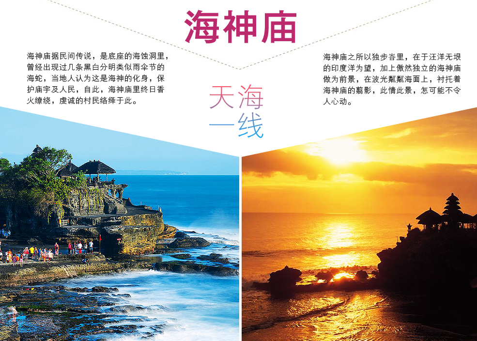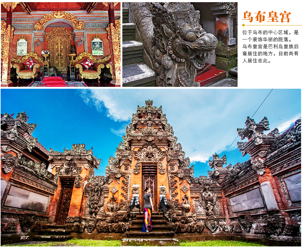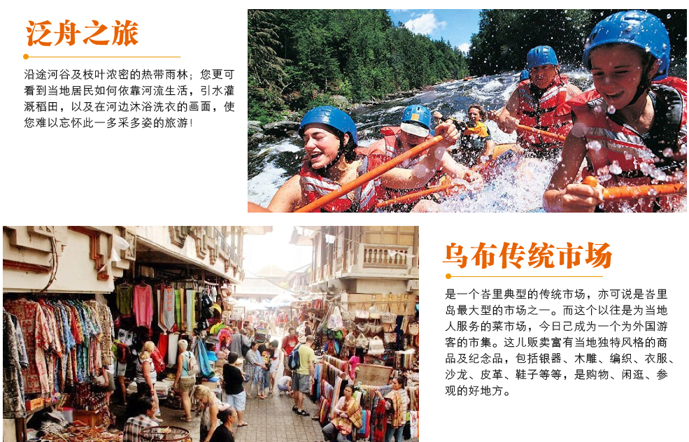 早餐后专车前往乌布区沿途风景秀丽,绝对让您惊叹不已!参观乌布皇宫位于乌布的中心区域,是一个装饰华丽的院落。主要由乌布皇室的私家寺院PuraMarajan Agung寺、乌布民众的主要寺院Pura Desa Ubud寺和风景如画的Pura Taman Saraswati(乌布水宫)组成。乌布皇宫是巴利岛皇族后裔居住的地方,目前尚有人居住在此,为了不打扰当地人的生活,导游不适宜在皇宫内举旗大声做讲解。故讲解工作改为前往该景点的车上进行,抵达后导游带领前往皇宫门口,请自行参观拍照。接着是泛舟之旅沿途河谷及枝叶浓密的热带雨林;您更可看到当地居民如何依靠河流生活,引水灌溉稻田,以及在河边沐浴洗衣的画面,使您难以忘怀此一多采多姿的旅游!随后参观乌布传统市场是一个峇里典型的传统市场,亦可说是峇里岛最大型的市场之一。而这个以往是为当地人服务的菜市场,今日己成为一个为外国游客的市集。这儿贩卖富有当地独特风格的商品及纪念品,包括银器、木雕、编织、衣服、沙龙、皮革、鞋子等等,是购物、闲逛、参观的好地方。随后参观海神庙这儿灵气汇集,为难得圣地,便建议当地居民在此建立了这座庙。海神庙名称的由来,据民间传说,是底座的海蚀洞里,曾经出现过几条黑白分明类似雨伞节的海蛇,当地人认为这是海神的化身,保护庙宇及人民,自此,海神庙里终日香火缭绕,虔诚的村民络绎于此。海神庙之所以独步峇里,在于汪洋无垠的印度洋为望,加上傲然独立的海神庙做为前景,在波光粼粼海面上,衬托着海神庙的翦影,此情此景,怎可能不令人心动。接着前往库塔海滩号称巴厘岛上最美丽的海岸,这里的海滩平坦、沙粒洁白、细腻,是个玩冲浪、滑板的乐园。它过去只是巴塘至布吉伯宁苏拉之间的一个小村子,现在已经成为繁华的旅游胜地。