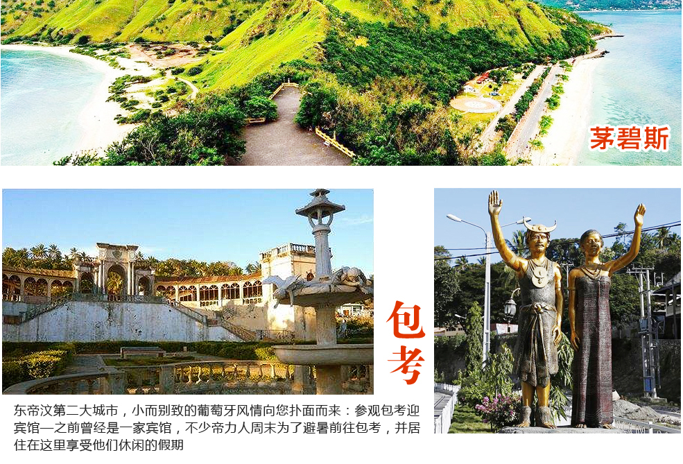 早餐后,我们将沿着东帝汶的滨海公路,途经马纳图托前往包考,沿途风景秀丽壮美,蓝天、白云、青山、绿树、碧海、黑礁、白沙滩构成了这条路的7种元素,蜿蜒的山路,美丽的海岸线,让人震撼;之后我们将抵达包考—东帝汶第二大城市,小而别致的葡萄牙风情向您扑面而来:参观包考迎宾馆—之前曾经是一家宾馆,不少帝力人周末为了避暑前往包考,并居住在这里享受他们休闲的假期,但是在印尼统治期间,它曾被做为审讯室;包考可爱的老城街道弯弯曲曲向下延伸,底部最引人注目的是葡萄牙统治时期建造的老市场遗址;晚餐后入住酒店休息。